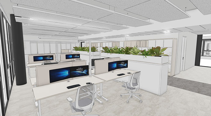 The available space is used optimally on the basis of intelligent office space planning. The planning lays the foundation for a working environment that meets today's requirements and is also equipped for future developments.