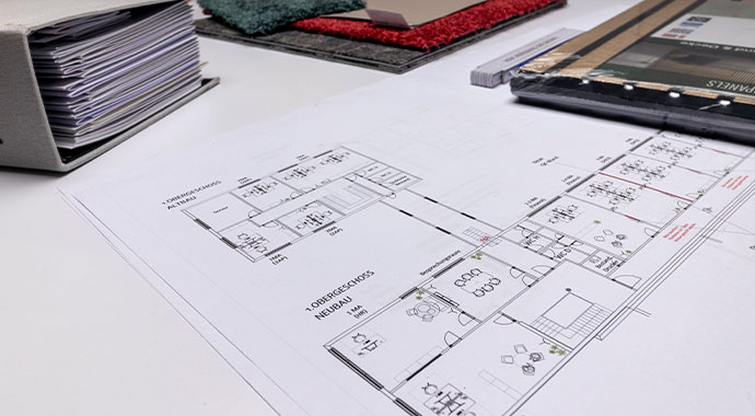 Office planning usually involves five different steps: Floor plan, colour and material concept, design concept, visualizations and furniture concept. This approach allows office planning to harmonize room function, aesthetics and work processes.