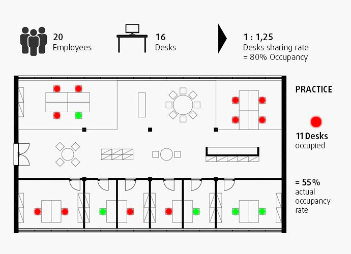 The exact calculation varies from company to company. It can be based on the use of workstations and can be calculated by adjusting the calculation basis or attendance statistics, for example using workforce management software. An exemplary result is 1:1.25. This means 16 available workstations for 20 employees, which would correspond to an occupancy rate of 80 percent. In practice, however, this can vary.