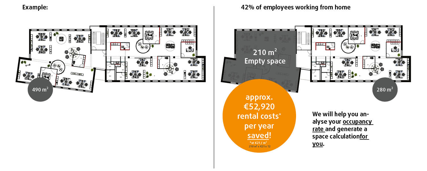 With the desk sharing concept, the number of workstations is lower than the number of employees. This makes optimum use of space, promotes flexible working and saves costs. The desk sharing ratio shows the ratio of available workstations to employees.