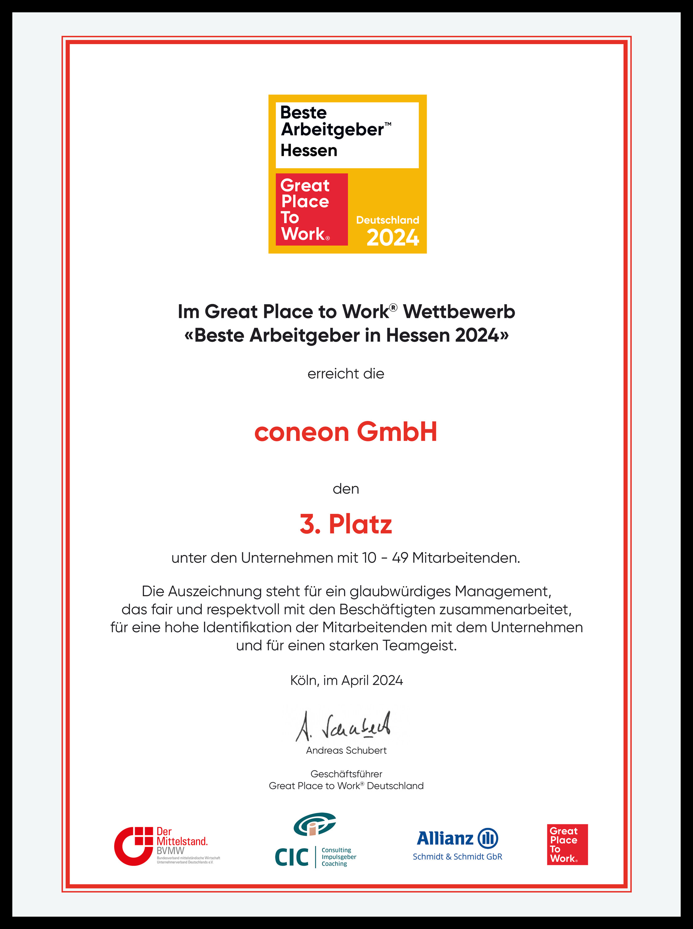 coneon GmbH hat sich im international bewährten Zertifizierungsprozess dem Urteil seiner Mitarbeitenden gestellt und ist von Great Place to Work® für seine erlebte Arbeitgeberattraktivität zertifiziert. Die Auszeichnung steht für eine glaubwürdige, faire Führung und die aktive Förderung der Mitarbeitenden. Respekt, Vertrauen, Stolz und Teamgeist sind in hohem Maße Teil der Unternehmenskultur. Diese Auszeichnung bestätigt, dass wir nicht nur ein modernes und inspirierendes Unternehmen sind, sondern auch ein Arbeitsumfeld bieten, in dem sich unsere Mitarbeitenden wohlfühlen und ihr volles Potenzial entfalten können.