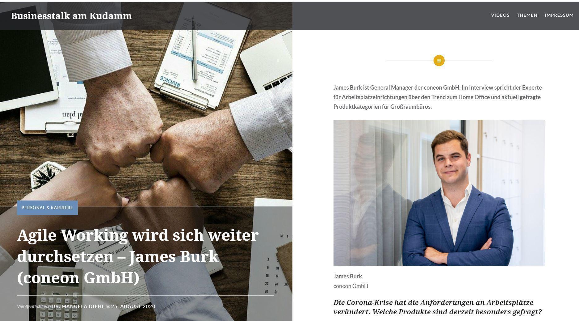 James Burk ist General Manager der coneon GmbH. Im Interview spricht der Experte für Arbeitsplatzeinrichtungen über den Trend zum Home Office und aktuell gefragte Produktkategorien für Großraumbüros.