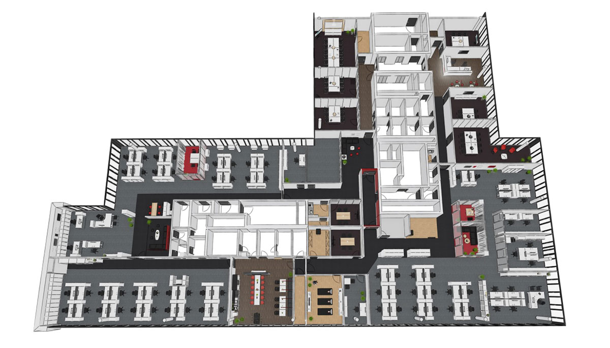 Für den Umbau der Fläche erstellte coneon detaillierte und baubegleitende Pläne und leistete umfassende planerische Unterstützung, zum Beispiel bei der Positionierung von Bodentanks sowie von Wand- und Bodenanschlüssen. Der Zeitplan war ambitioniert, dennoch wurde die Fläche einschließlich Lieferung der Büromöbel und Installation der Medientechnik pünktlich zum Umzugstermin fertig.