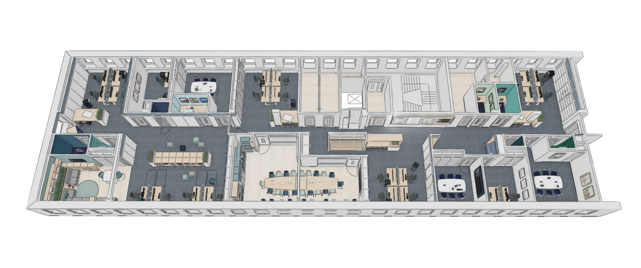 Bildung und Wissen bekommen einen Raum: FREIraum. Eine klare, aber weiche Formsprache durchzieht den Stil der neuen Flächen und bietet Platz für Weite, Wandel und Transparenz, Ideen und Produktivität. Ein dezentes und zeitloses Design der Flächen stehen im Einklang mit Fortschritt und Digitalisierung, in der die neue Arbeitsweise gelebt und erlebt werden kann.